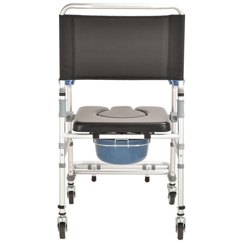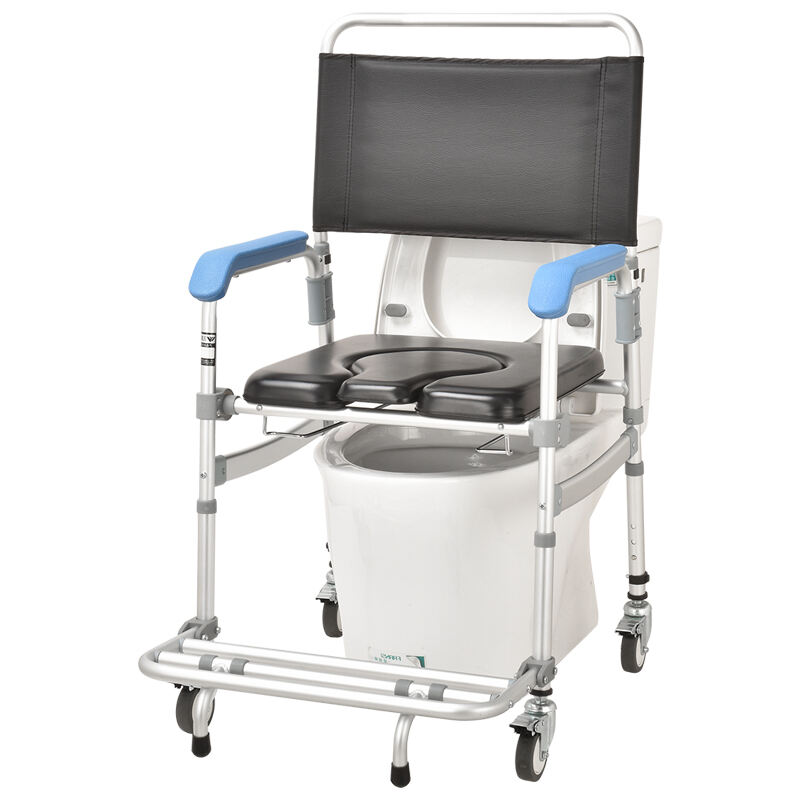 軽量アルミニウム製ポータブルトイレチェアで高さ調整機能と3インチロック付きキャスターを搭載。高齢者、障害者、リハビリ患者向けに設計されています。
