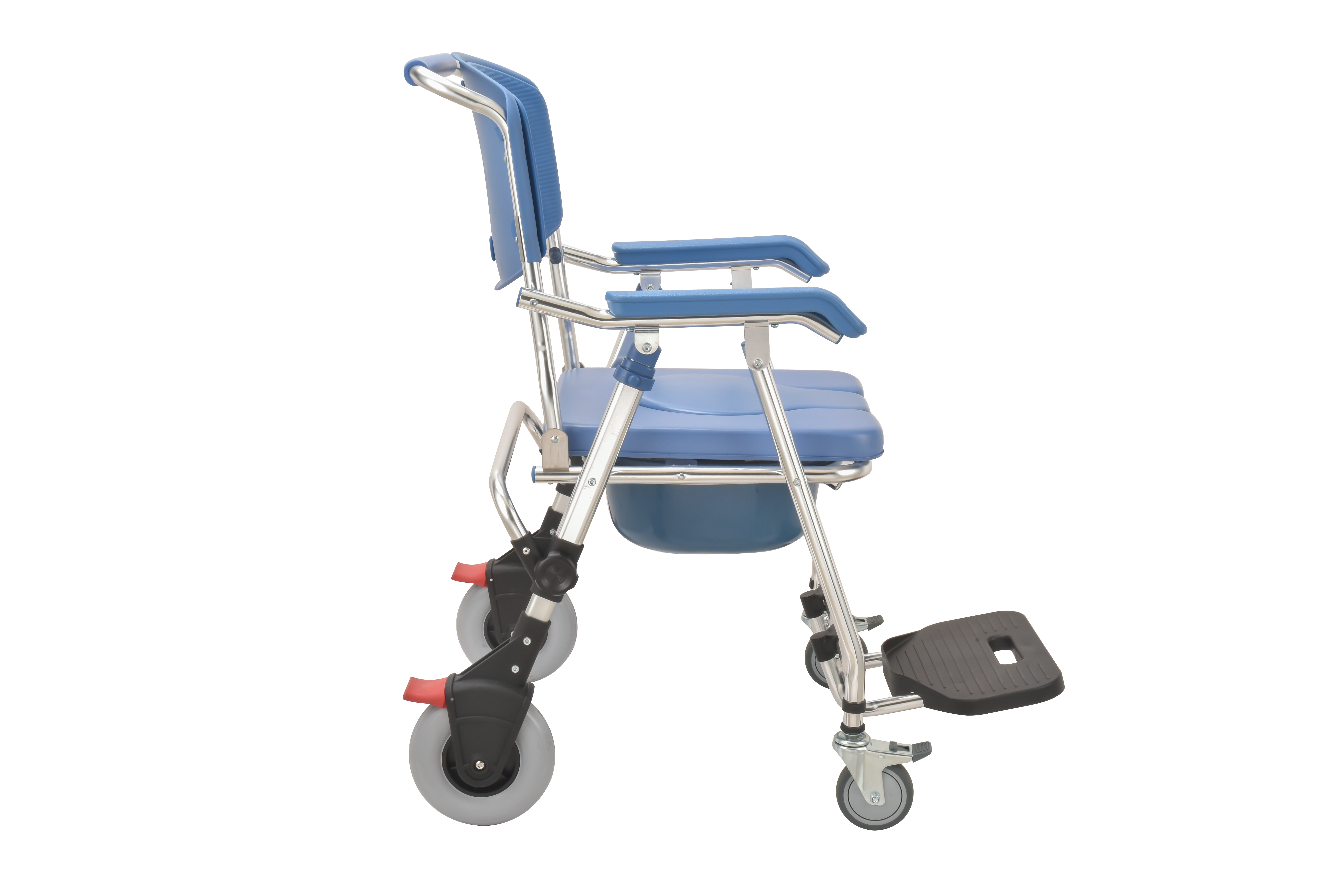 軽量アルミニウム製コンモードチェア。後輪、折り畳み式フットレスト、着脱可能なバケツ付き。病院、老人ホーム、高齢者介護に適しています。